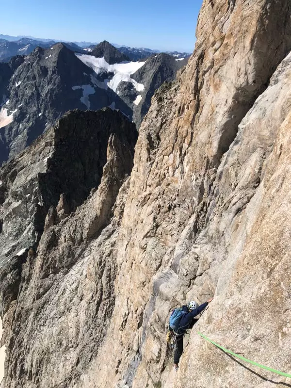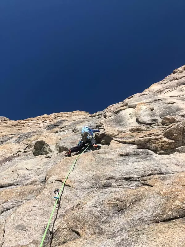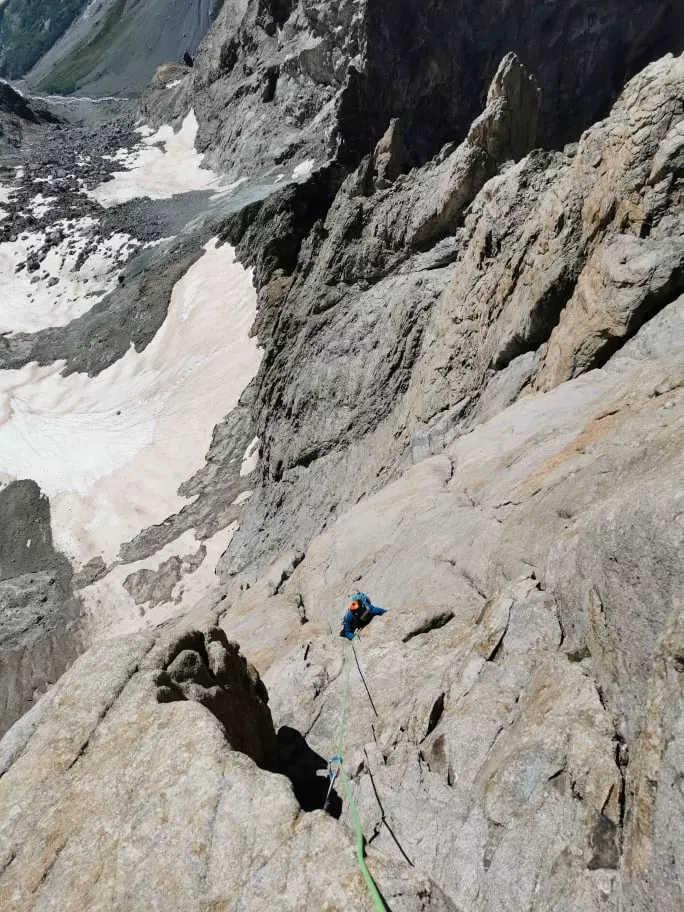 On attaque les premières longueurs en dalle sableuse, les pieds fuyants ne mettent pas en confiance. Ensuite la paroi se redresse, le rocher est parfait, sculpté de formes rondes. On rentre dans le vif du sujet à partir de la troisième longueur, l’escalade est plus technique et demande de la concentration. L’équipement est parfois éloigné et souvent difficile à completer. Les longueurs sont de plus en plus belles tout comme la vue sur le Pelvoux derrière nous.
