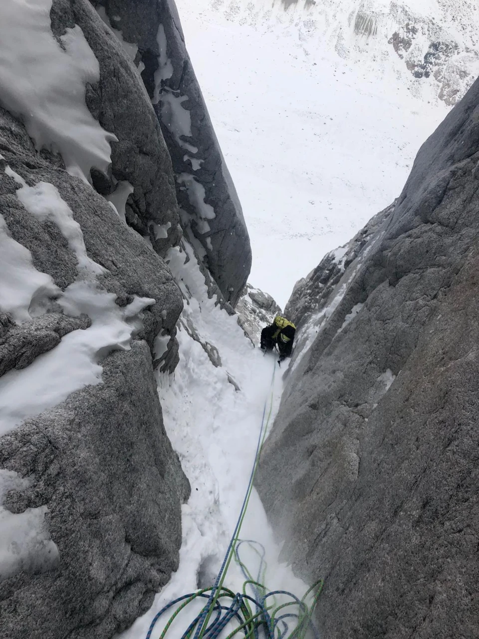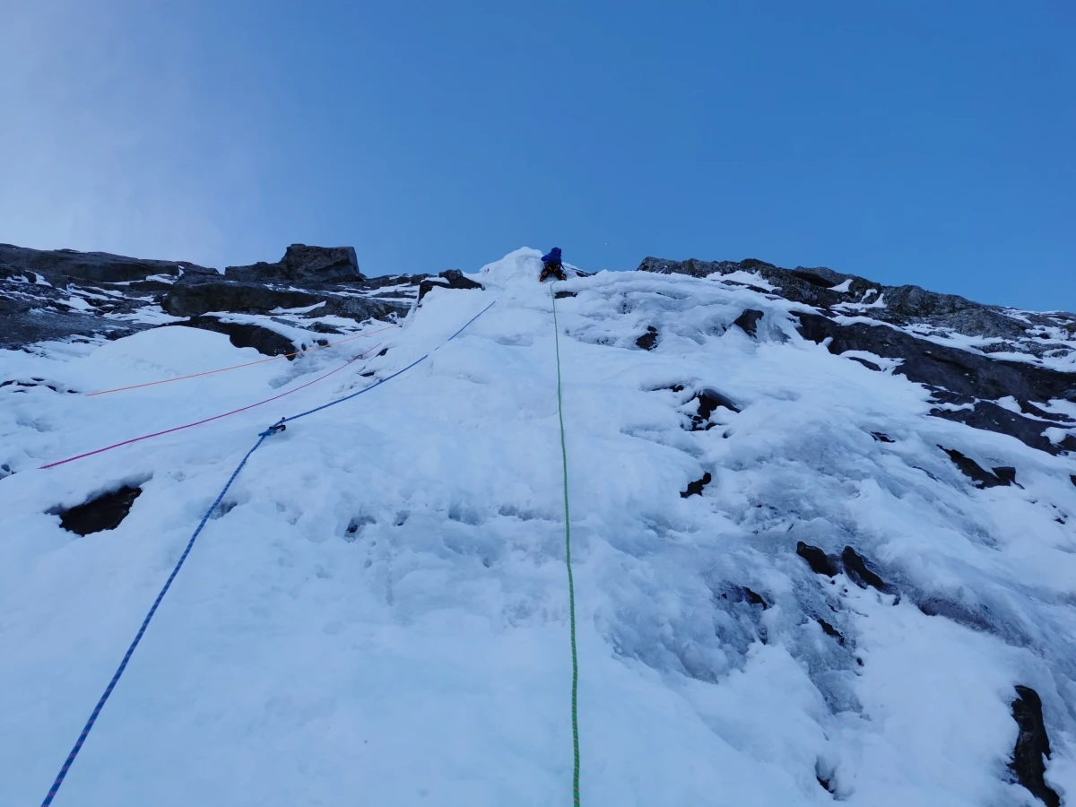 Les deux premières longueurs constituent un des passages clé de la goulotte car elles sont rarement en condition. Une variante plus à droite permet de les éviter par le rocher. Par chance, les conditions dans la première longueur semblent bonnes. Flo attaque, ce n’est pas de la glace mais de la neige dure qui permet une progression relativement facile mais les protections incertaines. Il trouve de quoi faire un relais dans la glace et je le rejoins. La deuxième longueur s’annonce plus complexe, il y a un ressaut vertical où le plaquage de glace semble fin… La première partie déroule bien mais lorsque Flo plante son piolet dans le plaquage ça sonne bien creux. Il va falloir être doux sur les appuis. Il s’en sort plutôt bien et rejoint le relais suivant. Même en second le ressaut n’est pas facile, il y a un passage presque déversant, ça réveille ! On a dépassé l’autre cordée et on remonte le couloir de neige jusqu’au ressaut suivant.
