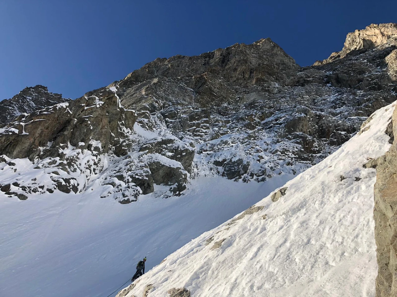 Je repasse devant pour remonter une section de pentes de neige entrecoupées de courts ressauts. On est repassé à l’ombre et il fait beaucoup plus froid entre ces immenses parois. Un troisième ressaut d’une dizaine de mètres juste assez fourni en glace permet d’accéder à la dernière longueur clé. Un ressaut raide et long d’une cinquantaine de mètres. Bien content de voir qu’il y a de la glace !