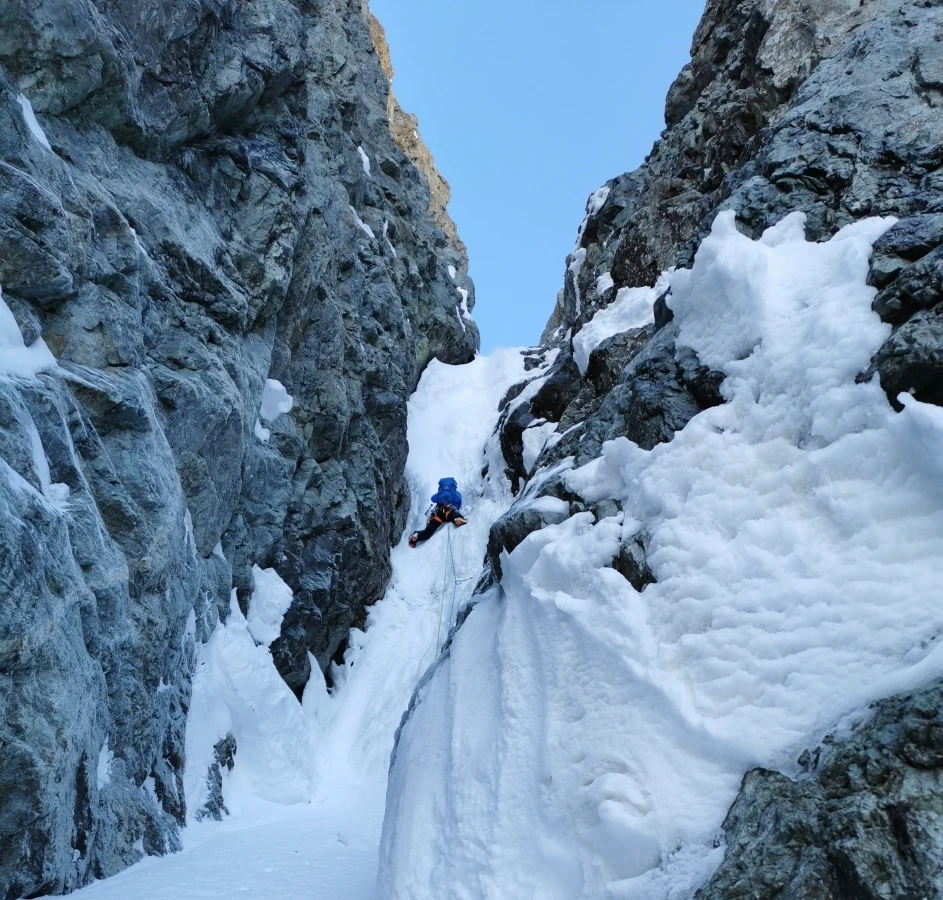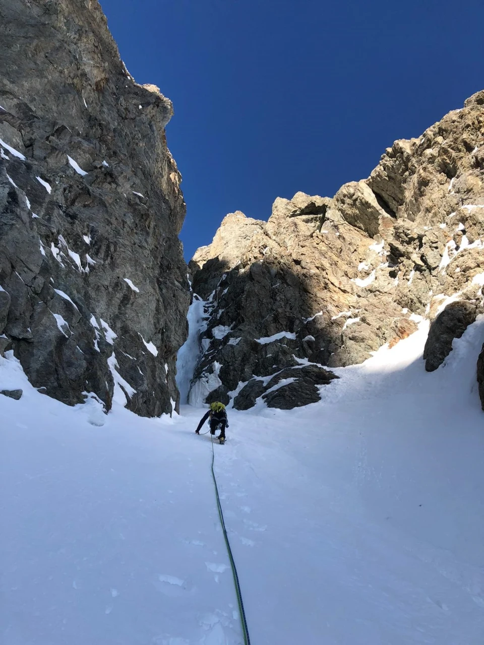 Il fait de plus en plus chaud, on grimpe sans gants et en polaire, chose plutôt rare en goulotte ! Le premier ressaut d’une vingtaine de mètres passe bien, il y a assez de glace pour mettre des broches. On remonte les dernières pentes de neige avant d’attaquer la partie encaissée plus technique de la goulotte. On aperçoit le deuxième ressaut, malheureusement il y a peu de glace et beaucoup de neige.