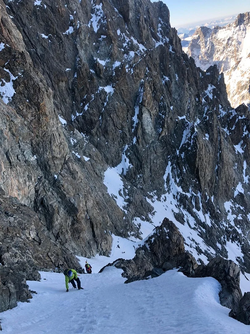 L’approche se fait bien sur une neige dure, le regel a été bon. Il faut un peu zigzaguer pour passer la rimaye qui commence à bien s’ouvrir. On attaque à remonter le couloir. Un premier court ressaut, puis un deuxième dans lequel on fera une longueur. Le jour se lève doucement, la vue sur le Pelvoux est magnifique. Les premiers rayons de soleil éclairent le Fifre pendant que nous arrivons au Col des avalanches.