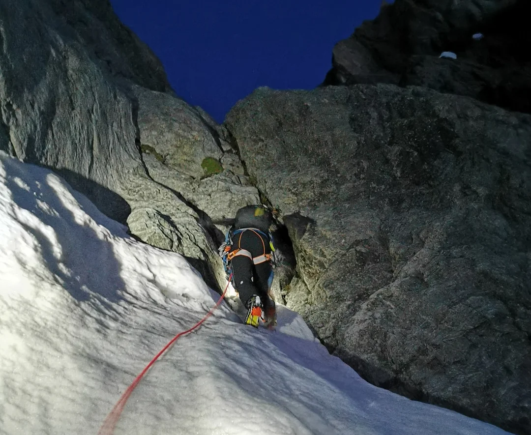 Départ matinal à 2 heures avec Flo et Jérôme du Pré de madame Carle direction le couloir des avalanches. Le couloir prenant le soleil très tôt (6 heures) et canalisant toutes les purges de la face Sud de la Barre, il ne fallait pas partir plus tard.