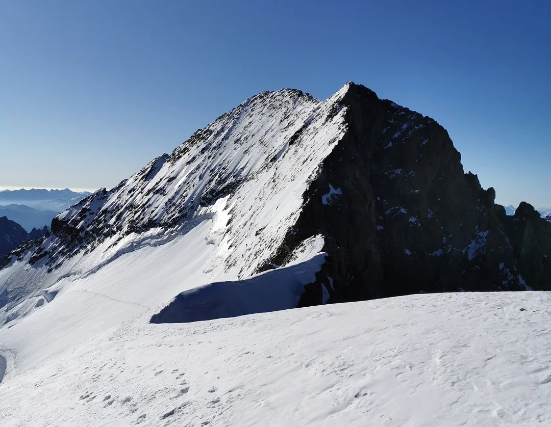 Petite pause pour profiter de la vue sur tous les géants des Ecrins et direction la brèche Lory pour accéder au Dôme des Ecrins. Là aussi la neige est dure et la montée se fait bien en crampons. Le passage de la brèche est en très bonnes conditions et nous voilà un peu avant 8 heures au Dôme.