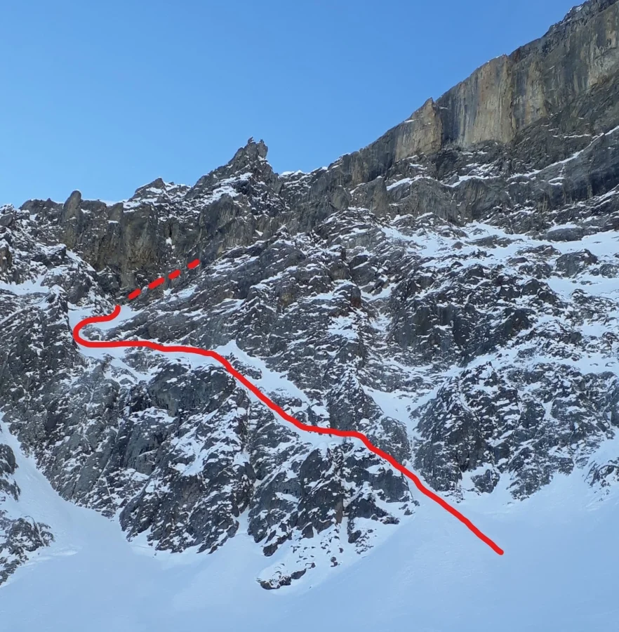 Pour ce cinquième jour de pente raide de la semaine, il fallait trouver un nouvel itinéraire. En fouillant un peu sur Skitour, j’ai trouvé « La faute à Raphougne ». Un seul compte rendu qui date de dix ans et une ligne qui serpente entre les barres rocheuses, c’est assez pour me convaincre d’aller y faire un tour!
