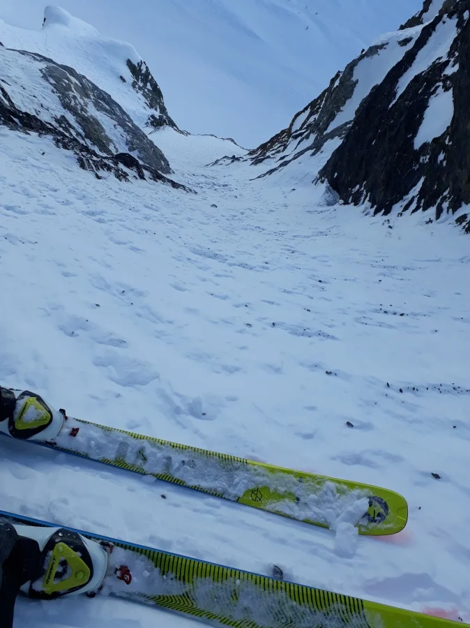 La première partie est raide, quelques virages avant de traverser pour éviter l’étroiture. La neige est meilleure que prévu sur la première pente suspendue. Çà déroule bien, les petits cailloux rapportés par le vent ne sont pas gênants. La neige est plus dure sur la deuxième pente suspendue. Une petite traversée permet de rejoindre les rampes au dessus des barres. De nouveau c’est plus raide, la neige est assez irrégulière mais ça reste skiant. Une dernière traversée pour rejoindre la rampe d’accès et me voilà sorti. La dernière partie est la plus technique car plus étroite et plus raide.