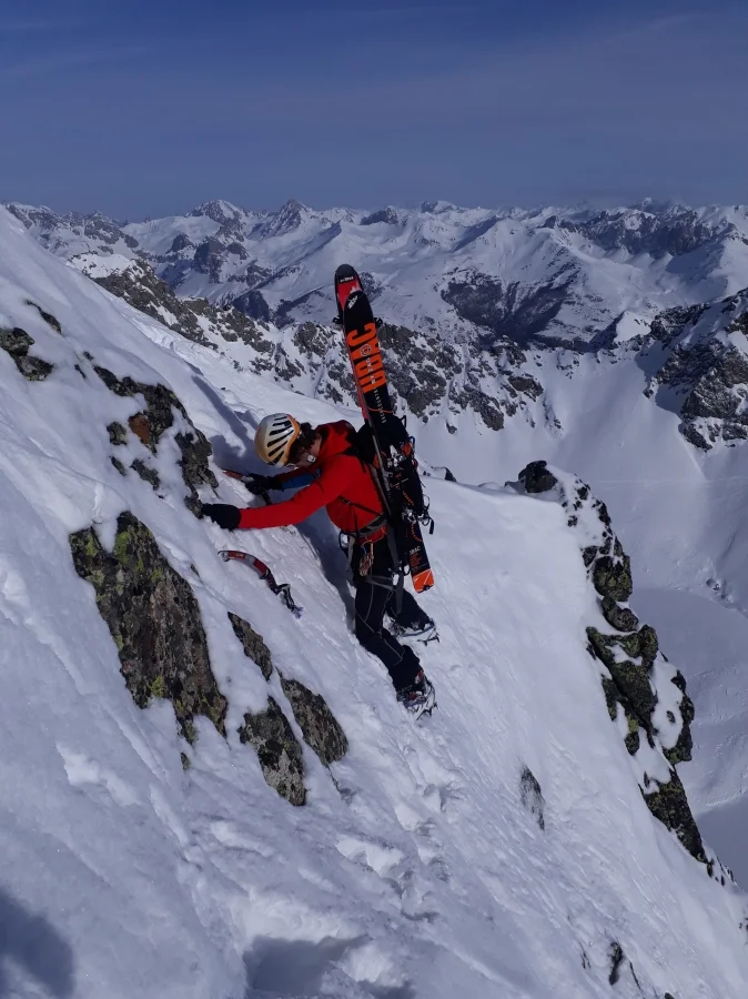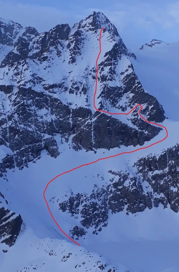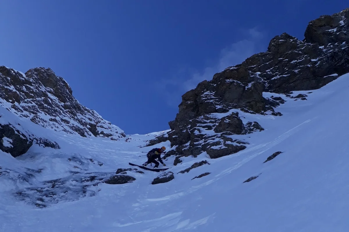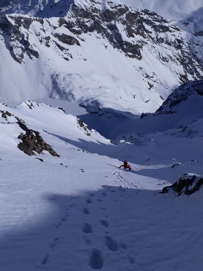 C’est partie pour la descente, les premiers mètres sont les plus raides on est tout de suite dans l’ambiance. La neige parfois croûtée nous force à être vigilants. Ça s’améliore bien ensuite, on enchaîne les virages dans une poudre froide jusqu’au ressaut. Un peu de dry-ski mais ça passe bien. Le deuxième est un plus délicat, encore du dry-ski sur quelques mètres, heureusement il y a de la glace pour ancrer le piolet.