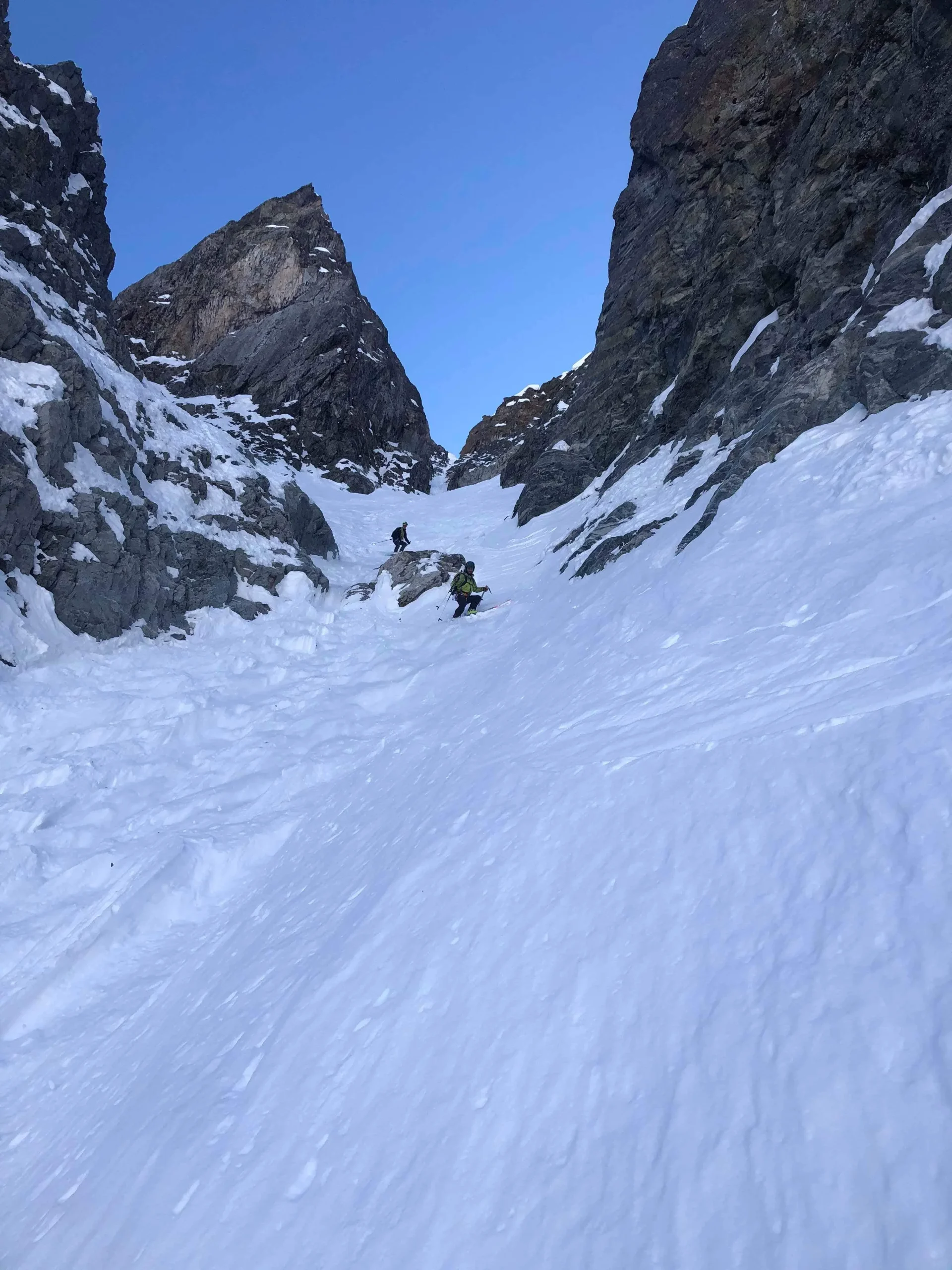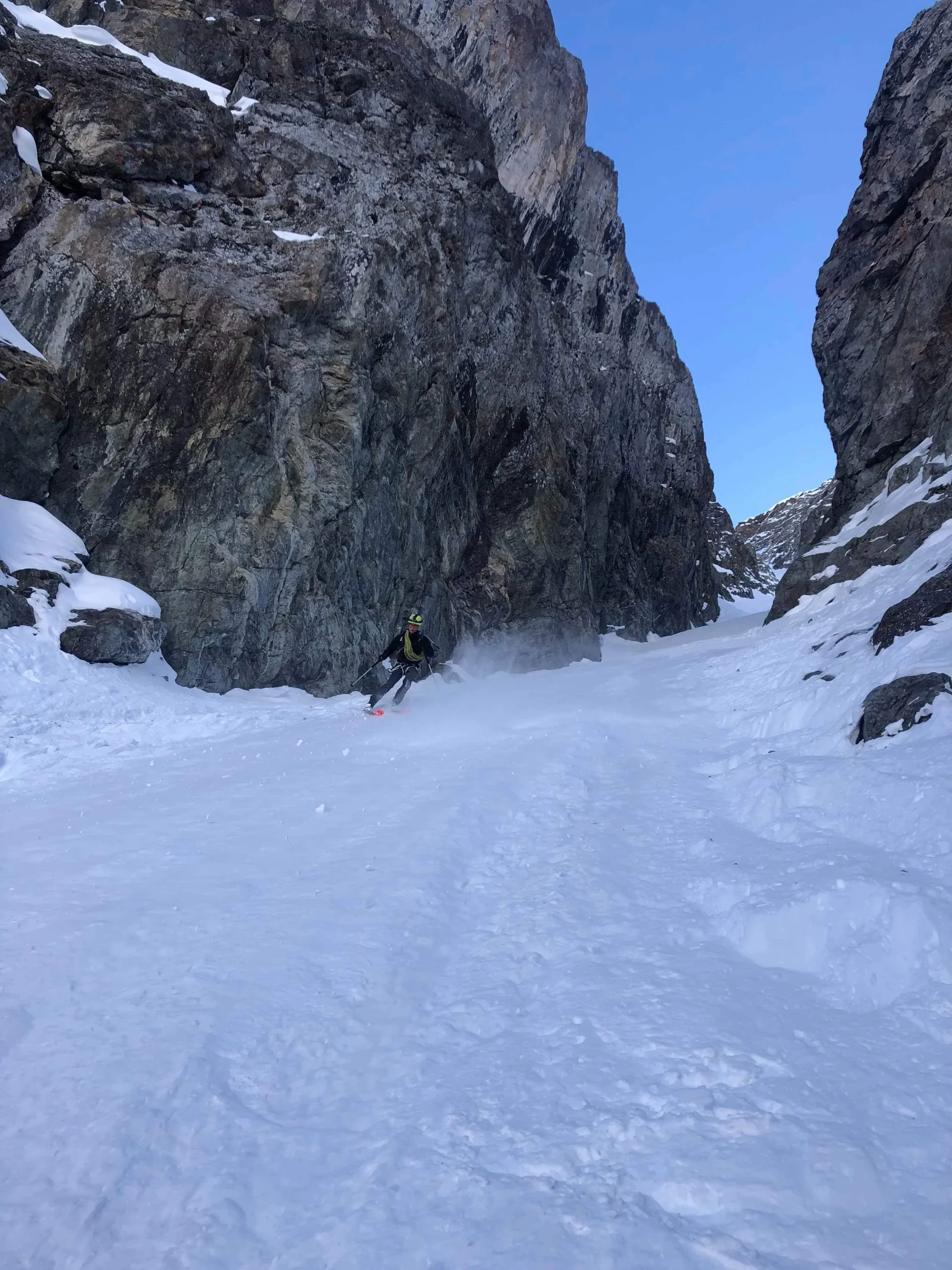 On installe le rappel qui permet de rentrer dans le couloir et on y va. Deux rappels sont nécessaires pour trouver suffisamment de neige pour skier. Ensuite le couloir est large, on se fait plaisir. La neige est toujours très agréable à skier.