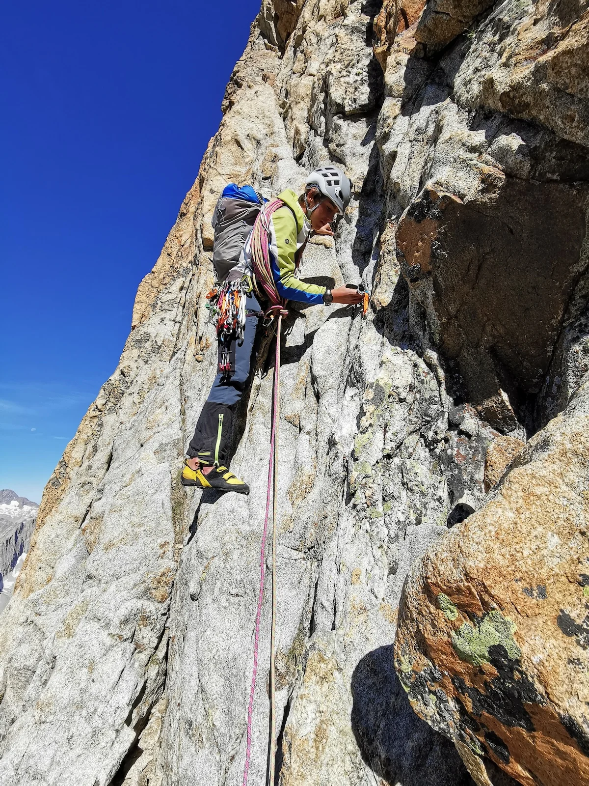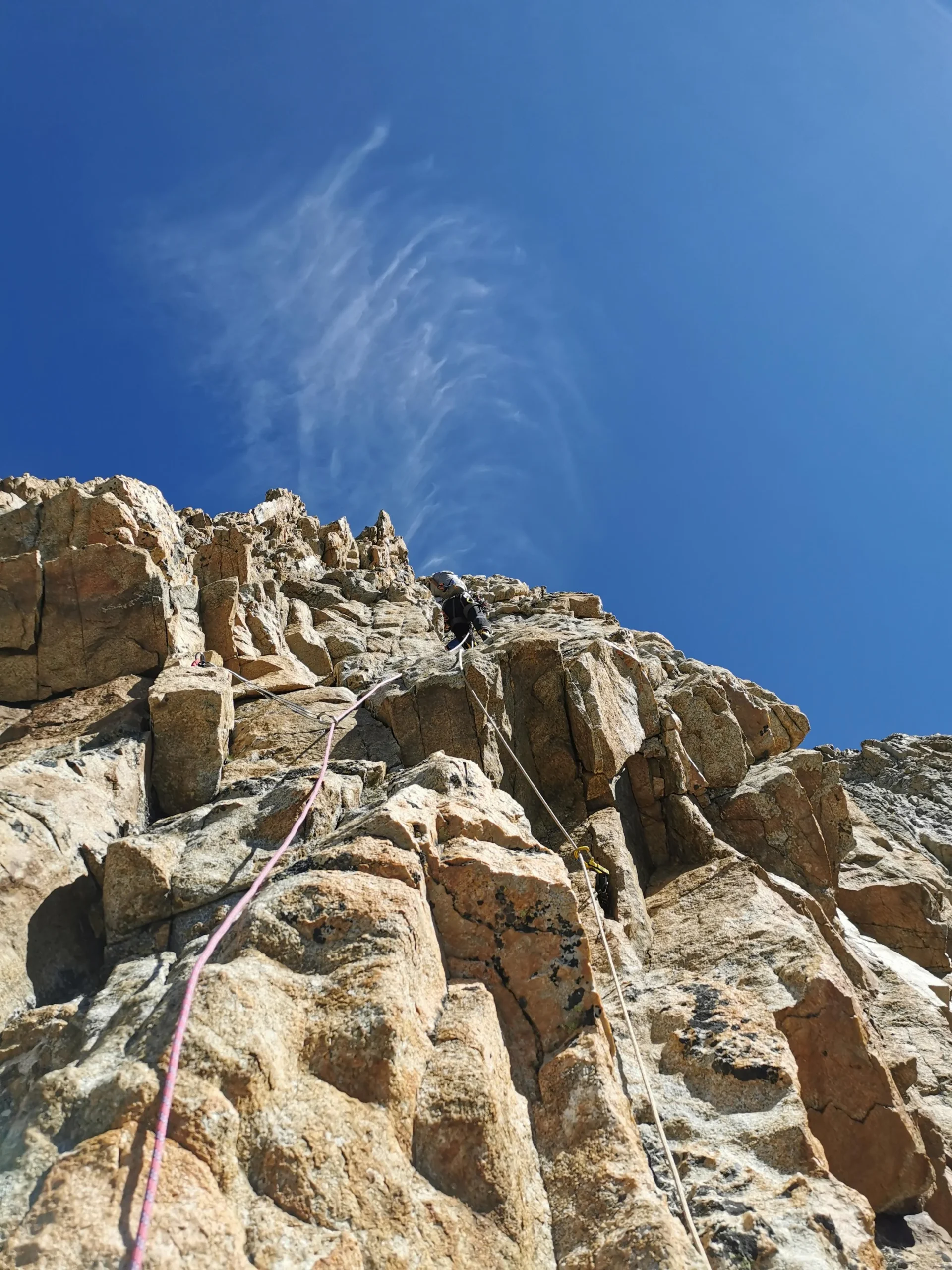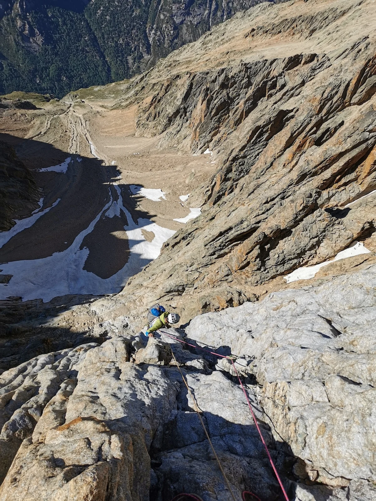 Départ à 5h30 le lendemain par une traversée de nuit dans des éboulis. On arrive à la brèche, pas de chance on coince le premier rappel. Je remonte jusqu’au relais pour décoincer la corde. Ensuite ça déroule et rejoint le pied de la voie. Je me lance dans la première longueur, l’escalade est jolie sur un rocher parfait. On retrouve presque le même granite qu’à Sialouze. On grimpe en réversible donc ça avance bien, la longueur en 6a ne pose pas de problèmes les difficultés sont concentrées sur quelques mouvements. A partir de L5 les difficultés diminuent mais une petite erreur d’itinéraire dans L8 nous fait perdre un peu de temps.